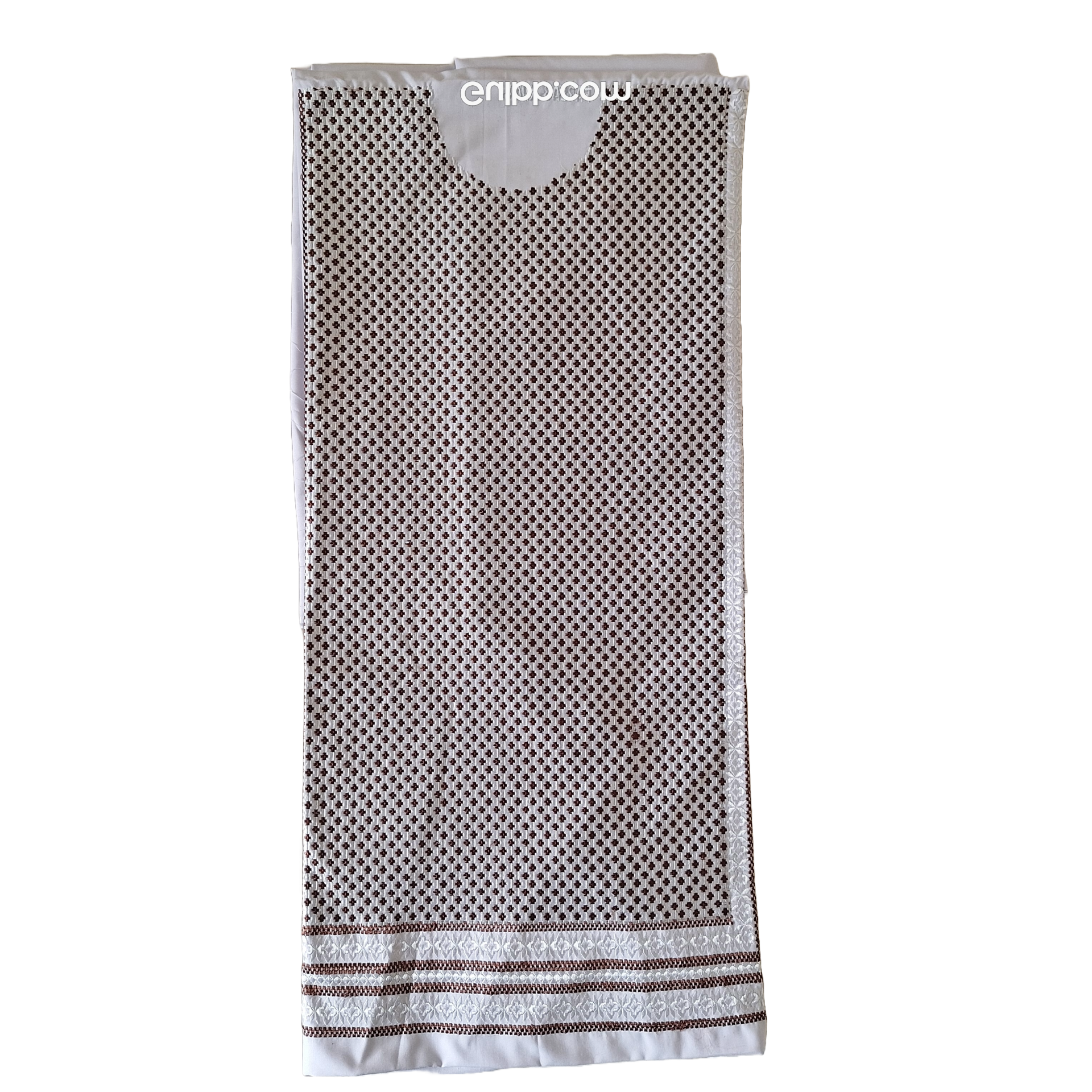 Chemise (peraan) with white, and brown squared embroidery at upper section. It has two buttons on each shoulder for extra comfort and style. Comes with a modern fitted partoog (tonbaan) for a relaxed fit.