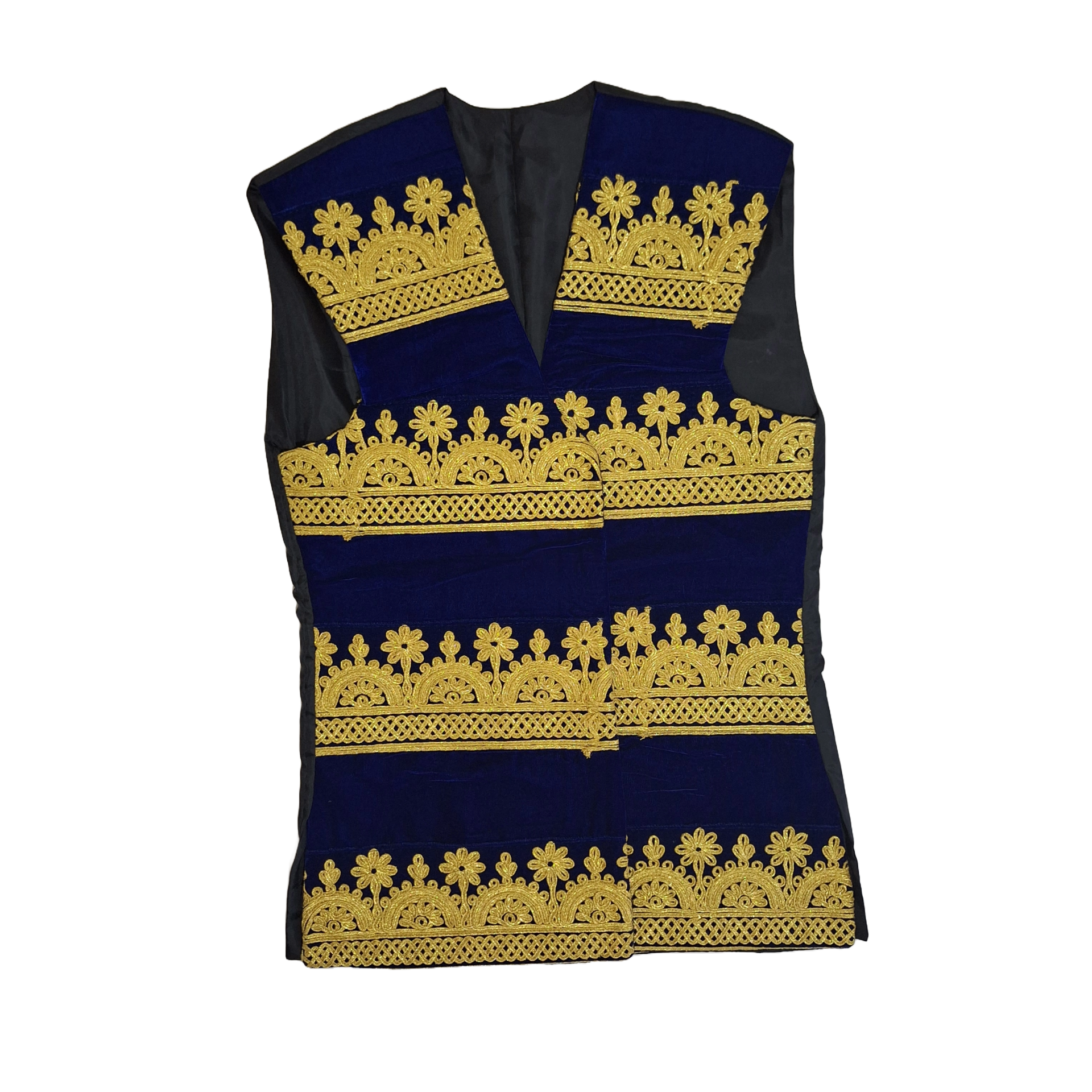A light to medium weight gold embroidered vest with a rich midight blue fabric. Playful yet classic!